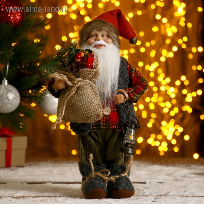 Дед Мороз "В клетчатой шубке, с фонариком и мешком" 30 см