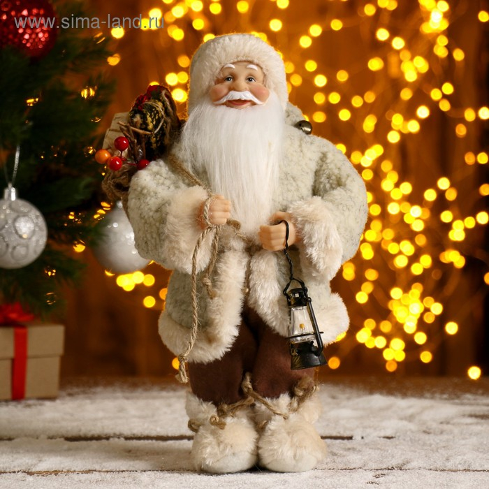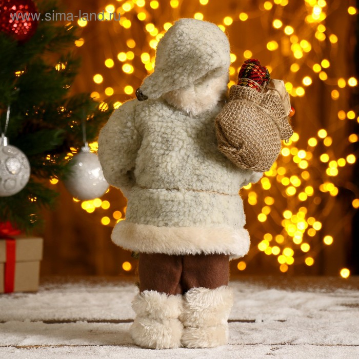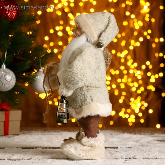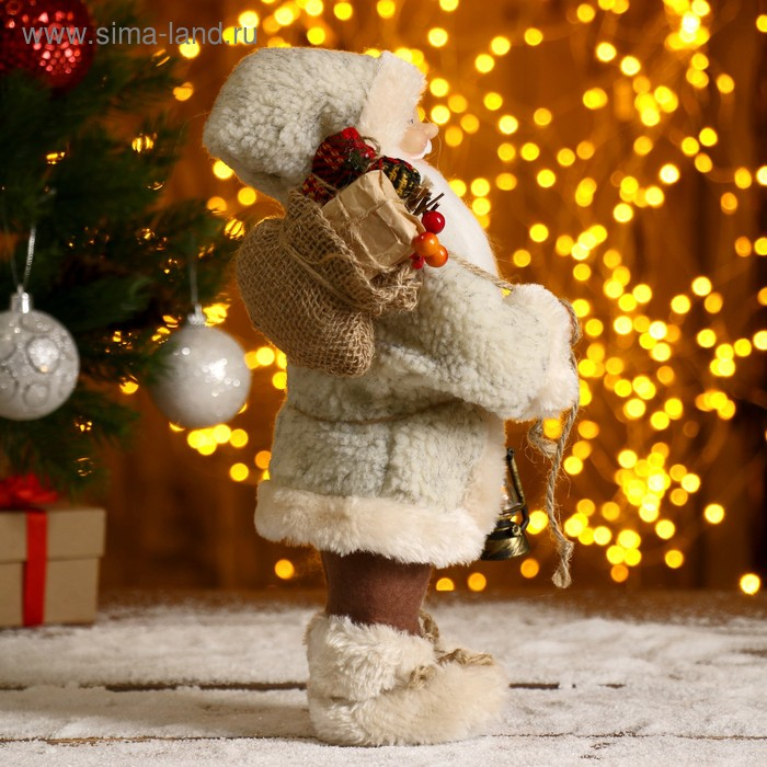 Дед Мороз "В белой шубке, с фонариком и мешком" 30 см