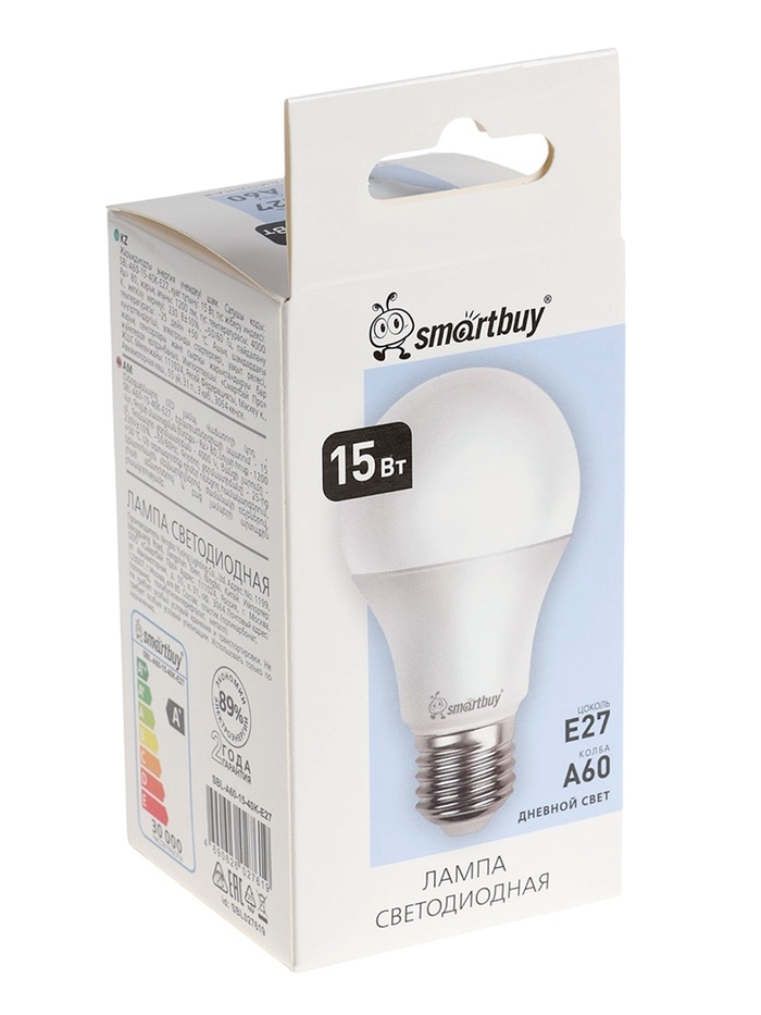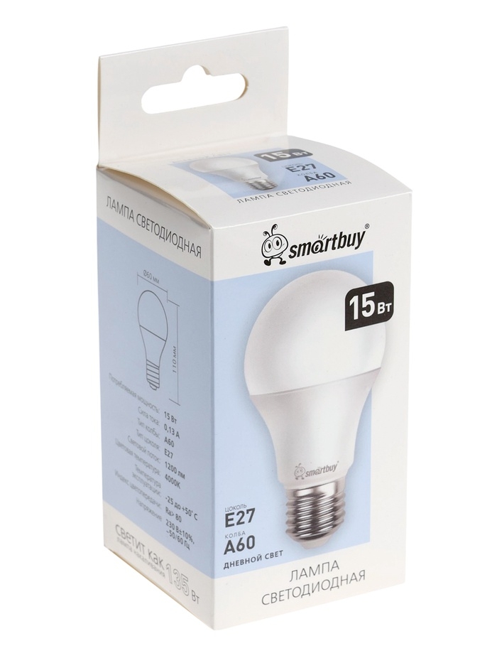 Лампа cветодиодная Smartbuy, E27, A60, 15 Вт, 4000 К, дневной белый свет