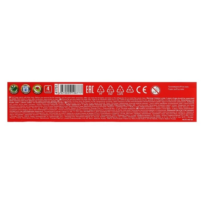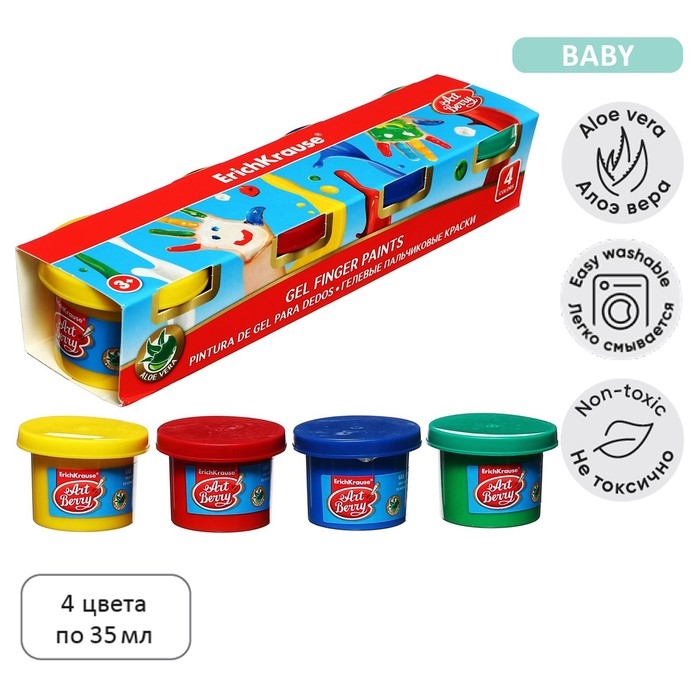 Краски пальчиковые, набор 4 цвета по 35 мл, ErichKrause ArtBerry премиум, гелевые, с Алоэ Вера, картонная упаковка