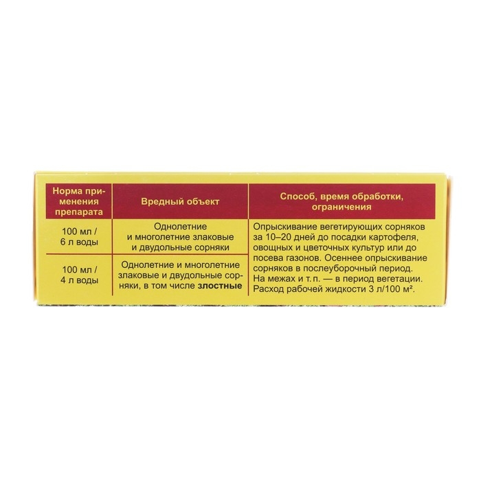 Для уничтожения однолетних и многолетних злаковых и двудольных сорняков, в том числе злостных. Применяется при опрыскивании вегетирующих сорняков до посадки картофеля, овощных и цветочных культур или до посева газонов, при опрыскивании сорняков в послеуборочный период, на межах и т. п. — в период вегетации.