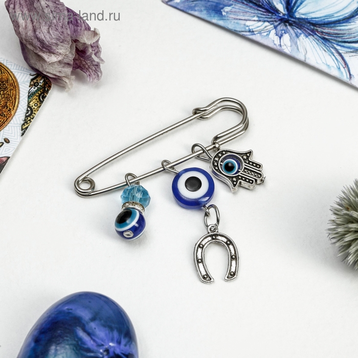 Булавка-оберег 3 подвески «Рука Хамса с подковой и бусиной», 5 см, цвет синий в серебре