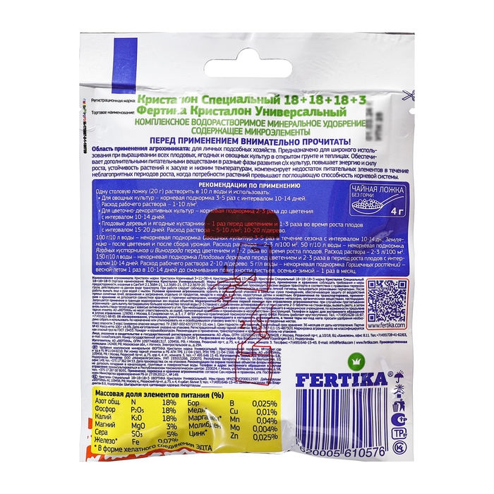 Fertika «Кристалон Универсальный» — это полностью водорастворимое комплексное азотно-фосфорно-калийное удобрение с микроэлементами. Оно предназначено для выращивания всех овощных и цветочных культур в открытом грунте и теплицах.