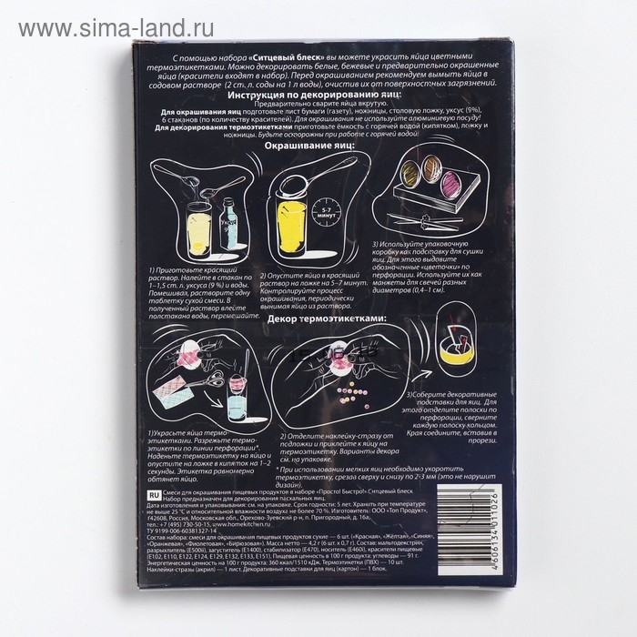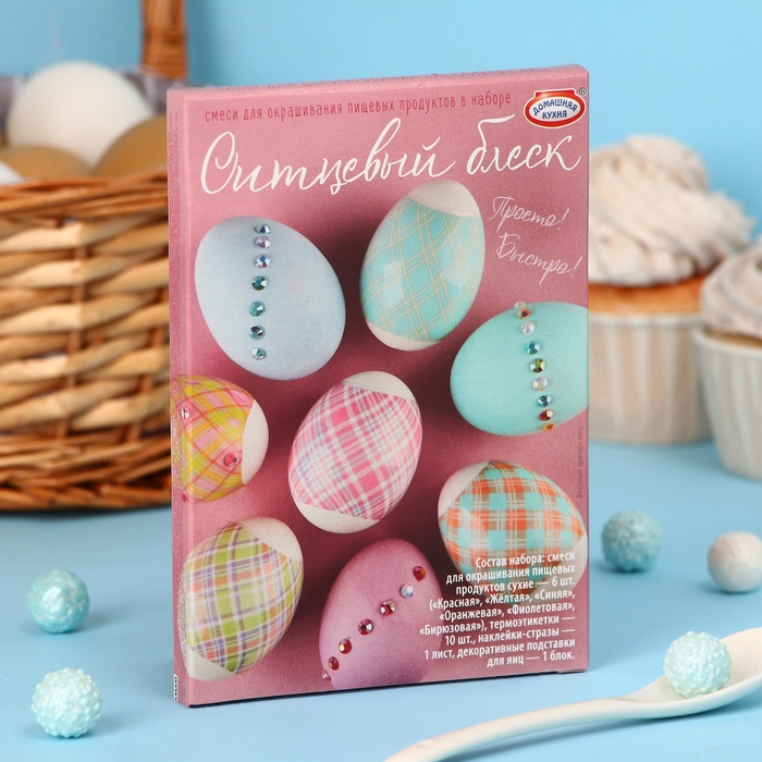 В данном наборе вы найдёте не только красители шести разных оттенков, но и заготовки. С их помощью можно сделать красивые и удобные подставки, на которых будут надёжно стоять пасхальные яйца. Также в каждом наборе есть декор, который оживит ваши пасхальные яйца и сделает их украшением любого праздничного стола.