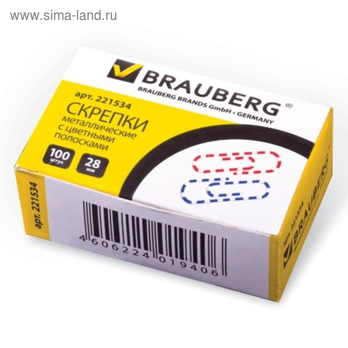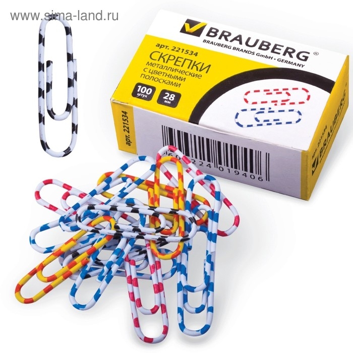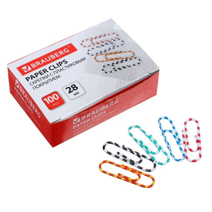 Скрепки BRAUBERG незаменимы в случаях, когда нужно соединить несколько бумаг, например, все листы договора. Скрепки изготовлены из стали, имеют классическую овальную форму и цветное пластиковое покрытие в полоску. Длина скрепки составляет 28 мм. Не окисляются и не повреждают документы. 100 штук в картонной коробке.
