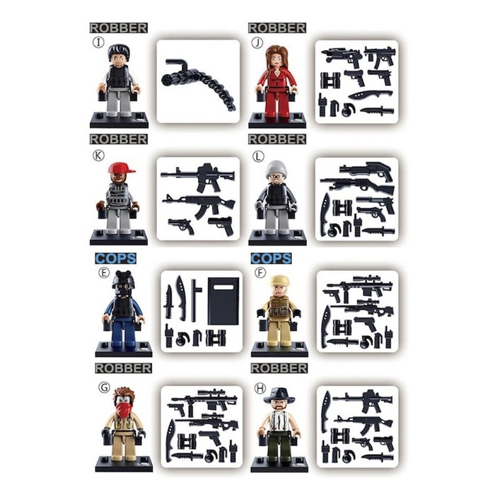 Соберите свою полицейскую команду с конструктором торговой марки Sluban. В каждом наборе вы найдёте одну фигурку стража порядка или грабителя. Объединяйте силы и защитите город от преступников.