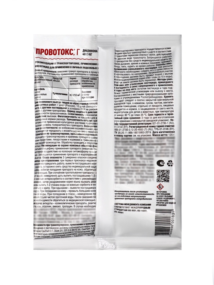 Способ применения: препарат раскладывается в лунки (на расстоянии 3-5 см от клубней) во время высадки картофеля. Раскладку препарата осуществлять утром (до 10:00) или вечером (после 18:00) в безветренную погоду при температуре не более 25ºС.
