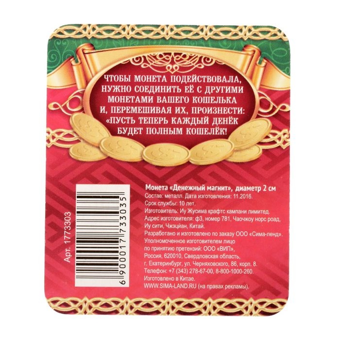 Чтобы всегда везло в денежных делах, монету можно положить в кошелёк – тогда он никогда не опустеет. Оригинальный сувенир и удачный подарок для каждого!