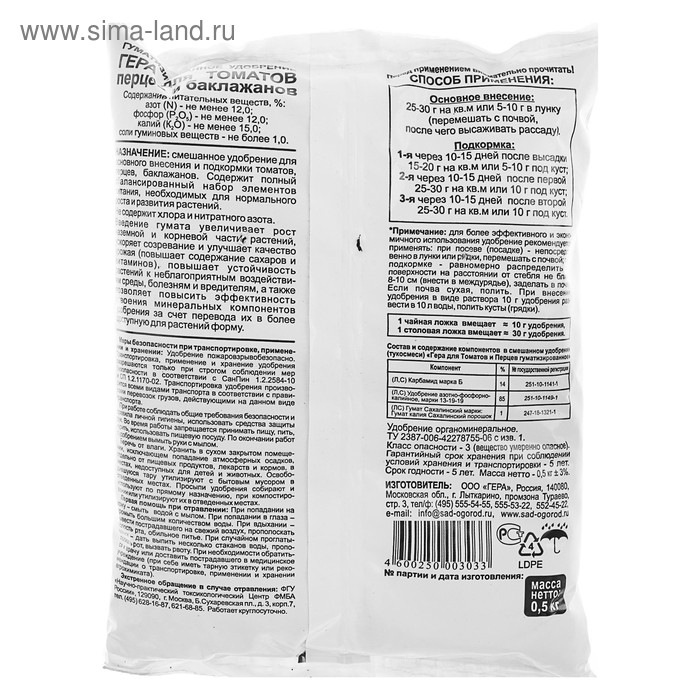 Удобрение "ГЕРА" для Томатов и Перцев 0,5 кг