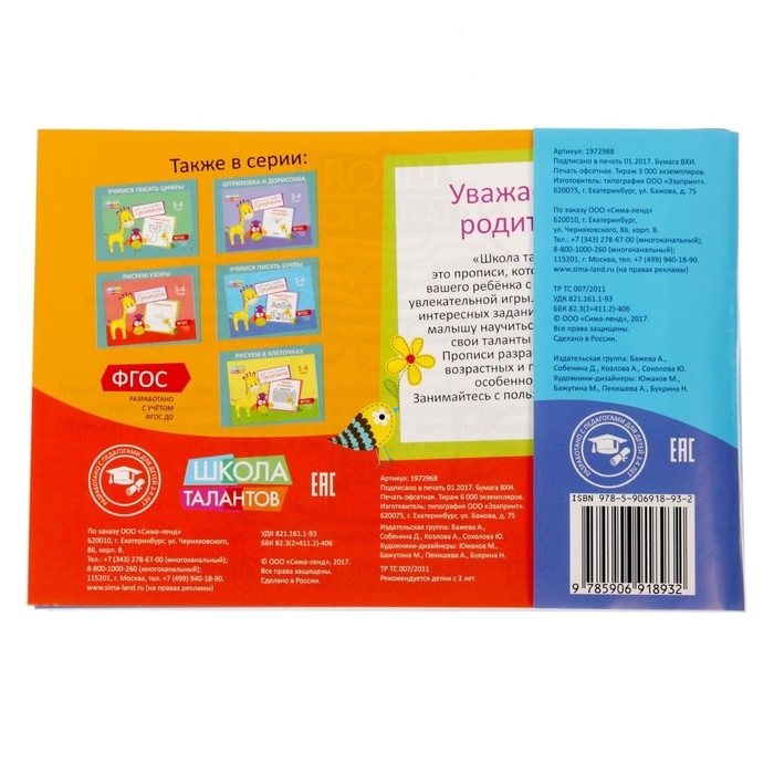 Серия «Мои первые прописи» познакомит ребёнка с письмом в форме увлекательной игры. Все элементы и картинки прорисованы толстым контуром, их удобно обводить и раскрашивать.