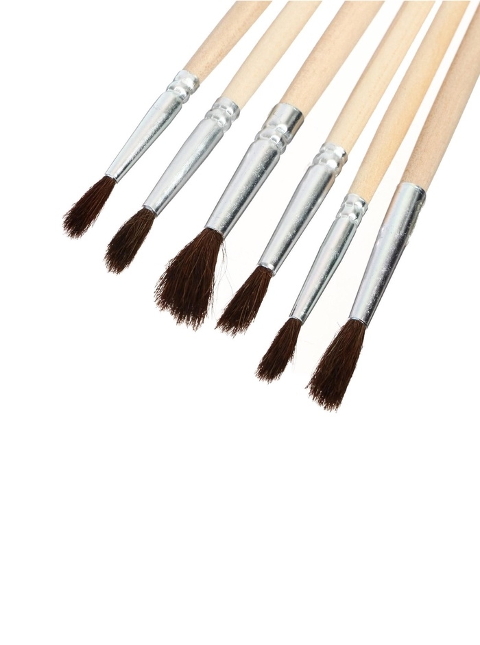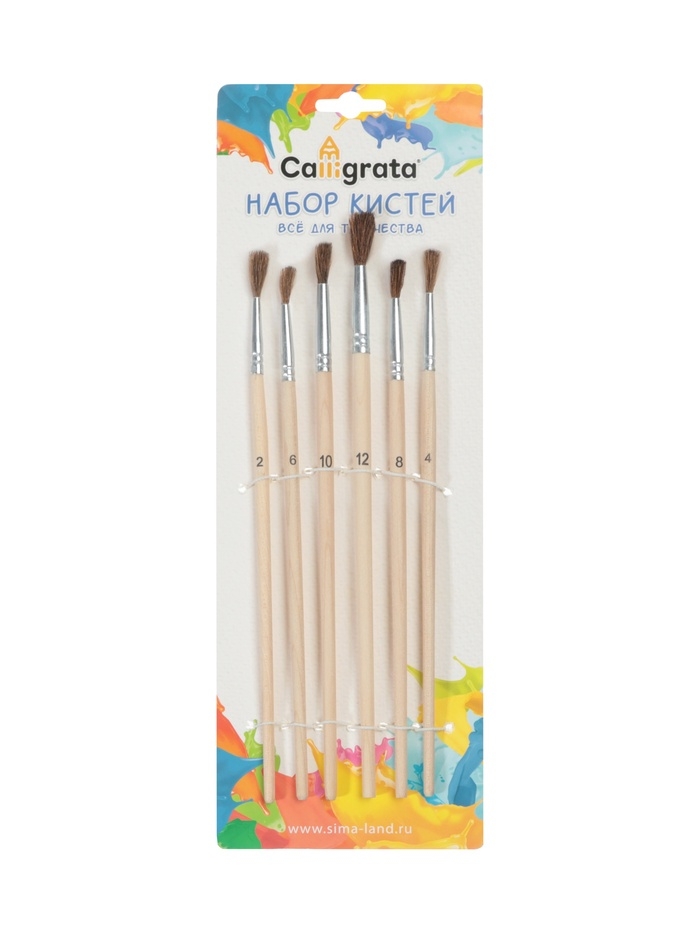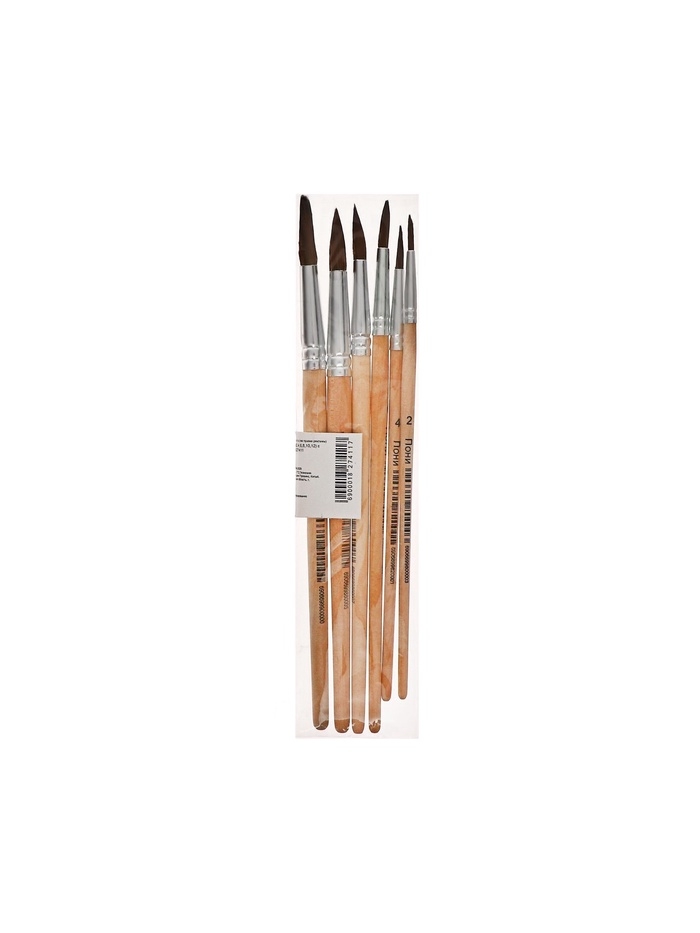 Набор кистей пони 6 штук (круглые:№ 2, 4, 6, 8, 10, 12), с деревянными ручками, на блистере