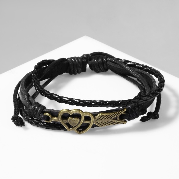 Браслет кожа «Стиль» два сердца, цвет чёрный с чернёным золотом, d=7,5 см