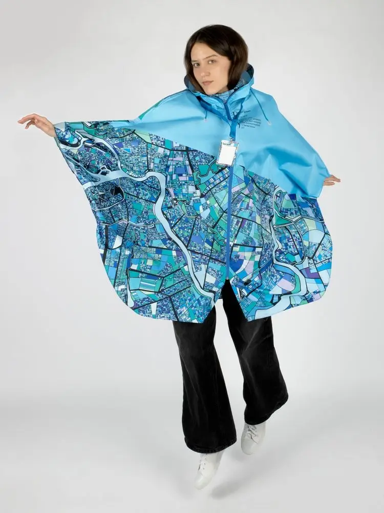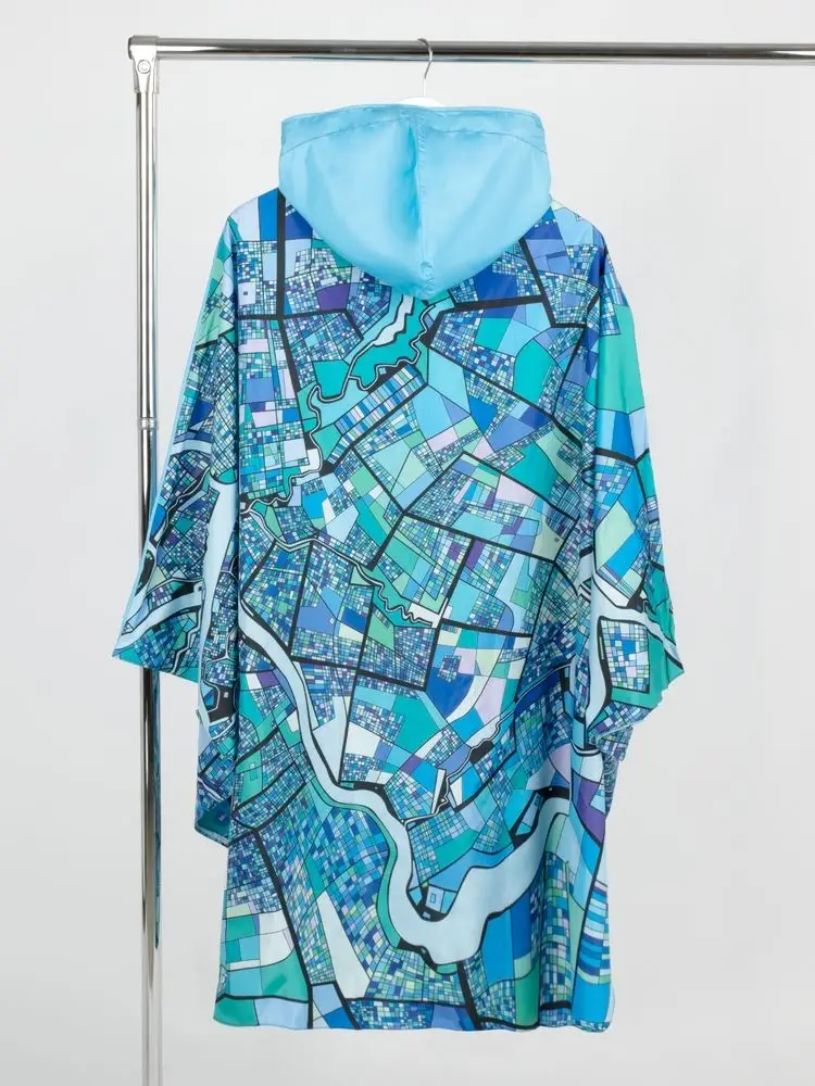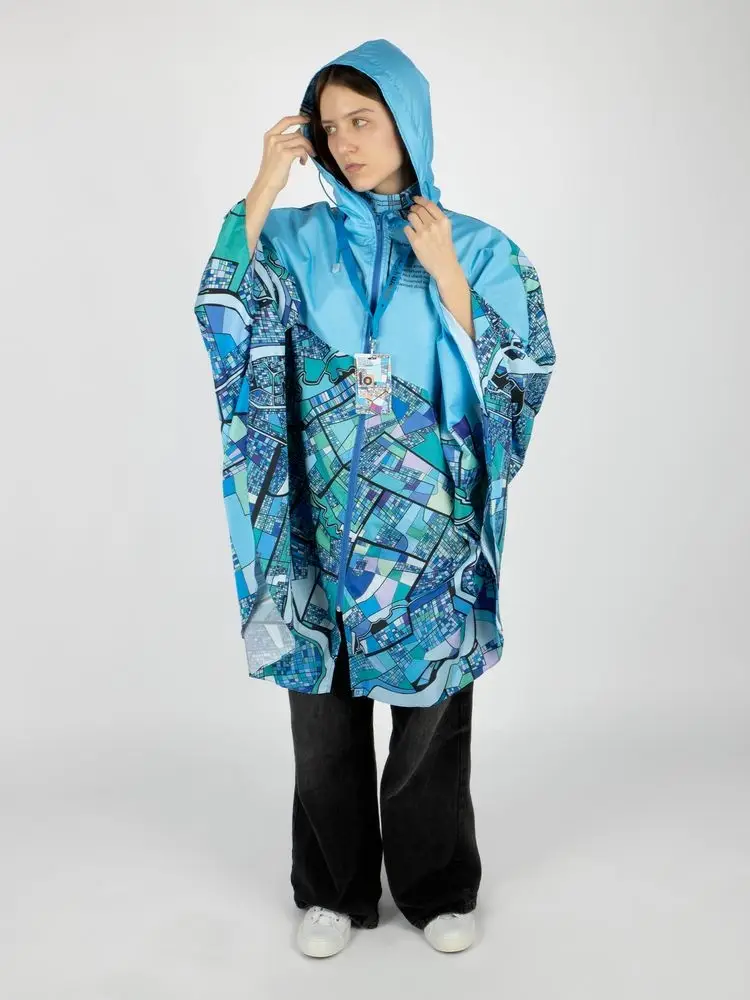 Легкий городской дождевик-пончо с регулируемым капюшоном из влагоустойчивого материала подходит для защиты в непогоду, свободно одевается поверх одежды и небольшого рюкзака.