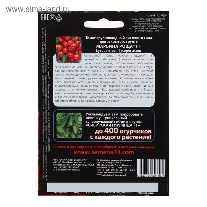 Семена Томат "Марьина Роща" F1 раннеспелый, крупноплодный, кистевого типа, 10 шт