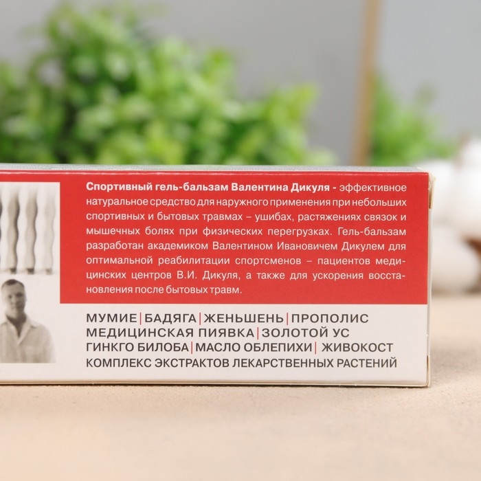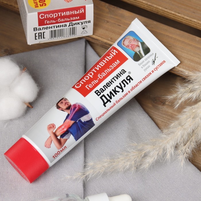 Спортивный гель-бальзам Валентина Дикуля (Специальный бальзам в области связок и суставов) - эффективное натуральное средство для наружного применения при небольших спортивных и бытовых травмах - ушибах, растяжениях связок, микротравмах суставов и позвонков, мышечных болях при физических перегрузках.