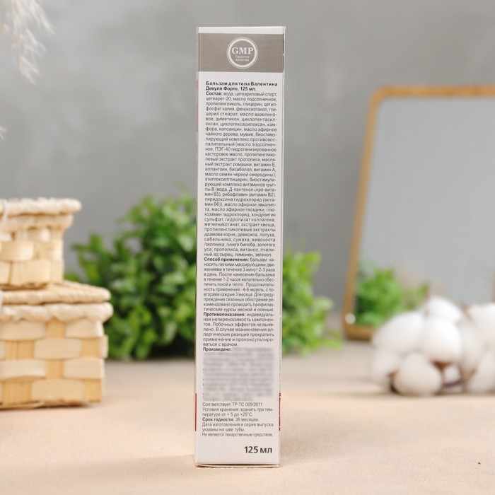 Состав: вода, цетеариловый спирт, вазелин, изопропилпальмитат, октилдодеканол, диметикон, цетеарет-20, глицерин, воск пчелиный, ланолин, биостимулирующий комплекс противовоспалительный (масло подсолнечное, ПЭГ-40 гидрогенизированное касторовое масло, пропиленгликолевый экстракт прополиса, масляный экстракт ромашки, витамин Е, аллантоин, бисаболол, витамин А, масло семян черной смородины), капсаицин, камфора, мумие, гидролизат коллагена, глюкозамина гидрохлорид, хондроитин сульфат, пропиленгликолевые экстракты адамова корня, девясила, лопуха, сабельника, сумаха, окопника (живокоста), гинкго билоба, золотого уса, прополиса, карбомер, витанол, пчелиный яд сырец, масло эфирное чайного дерева, масло эфирное эвкалипта, масло эфирное гвоздики, метилникотинат, гидроксид натрия, пропиленгликоль, метилпарабен, пропилпарабен, диазолидинилмочевина, метилхлороизотиазолинон, метилизотиазолинон, лимонен, эвгенол.
