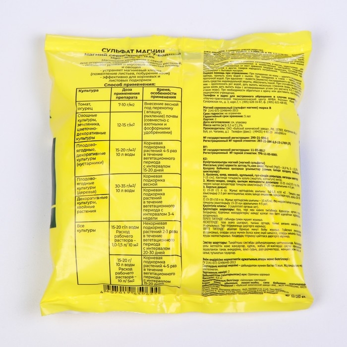 «Сульфат магния» — это комплексное минеральное удобрение универсального назначения для основного внесения и подкормок любых культур. В его состав входят магний (16,2 %) и сера (13,5 %). Растворимость — 100 %. Средство представляет собой белый кристаллический порошок.