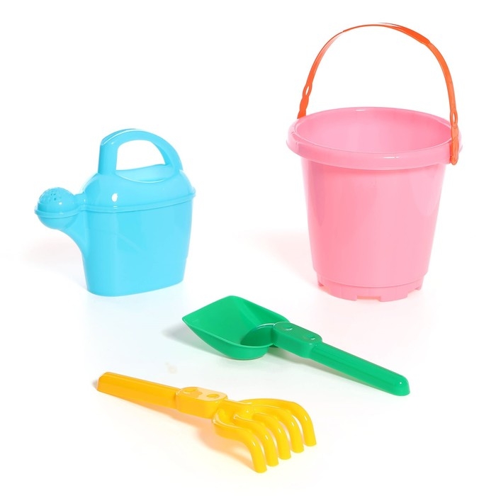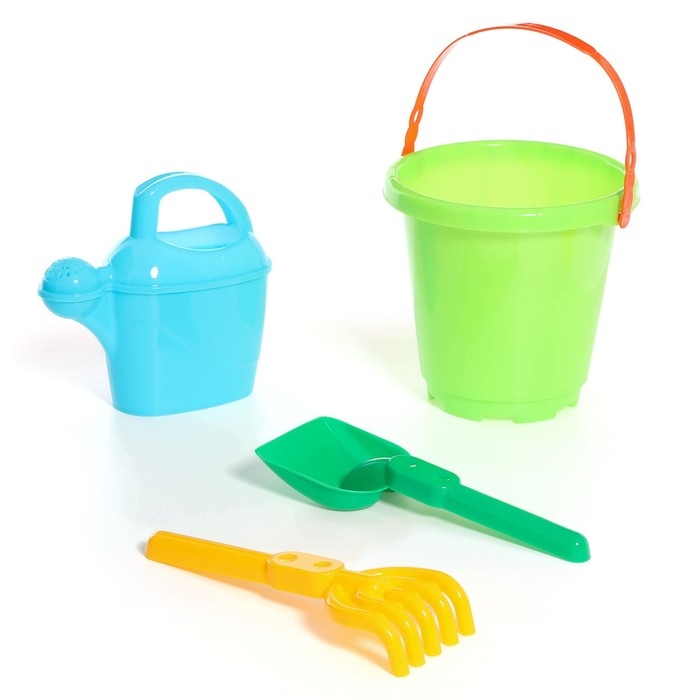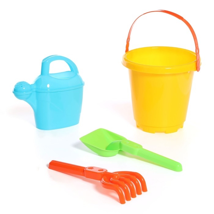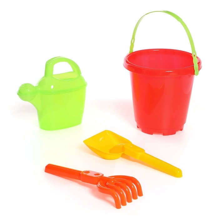 В набор входит: ведёрко, грабли, лопатка и лейка.