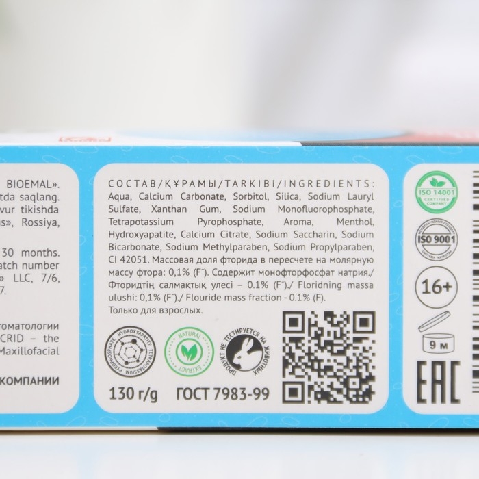 Состав: вода, карбонат кальция, сорбитол, гидратированная силика, натрия лаурилсульфат, ксантановая камедь, натрия монофторфосфат, Тетропирофосфат калия, ароматизатор, ментол, натрия сахаринат, гидроксиапатит, цитрат кальция, натрия бикарбонат, метилпарабен, пропилпарабен.