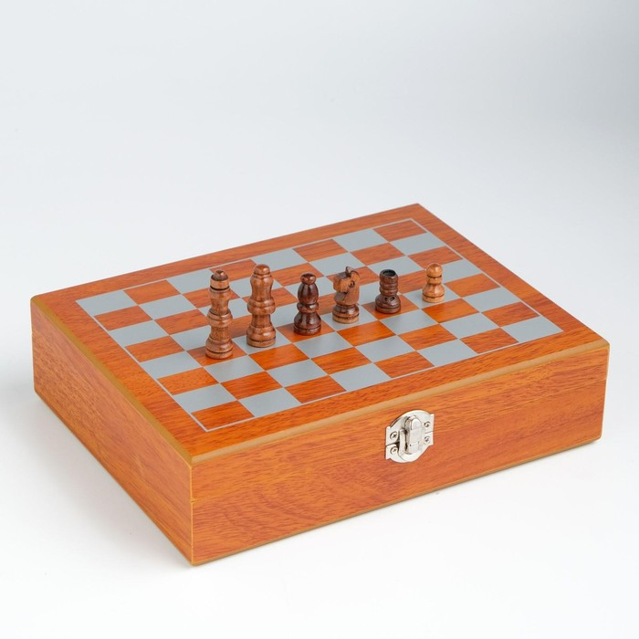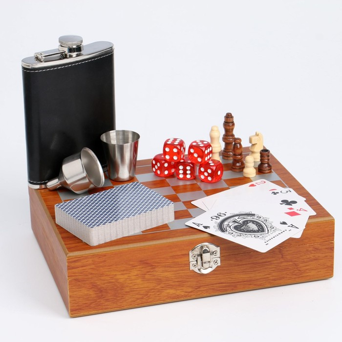 Подарочный набор 6 в 1: фляжка 8 oz, рюмка, воронка, кубики 5 шт, карты, шахматы, 18 х 24 см