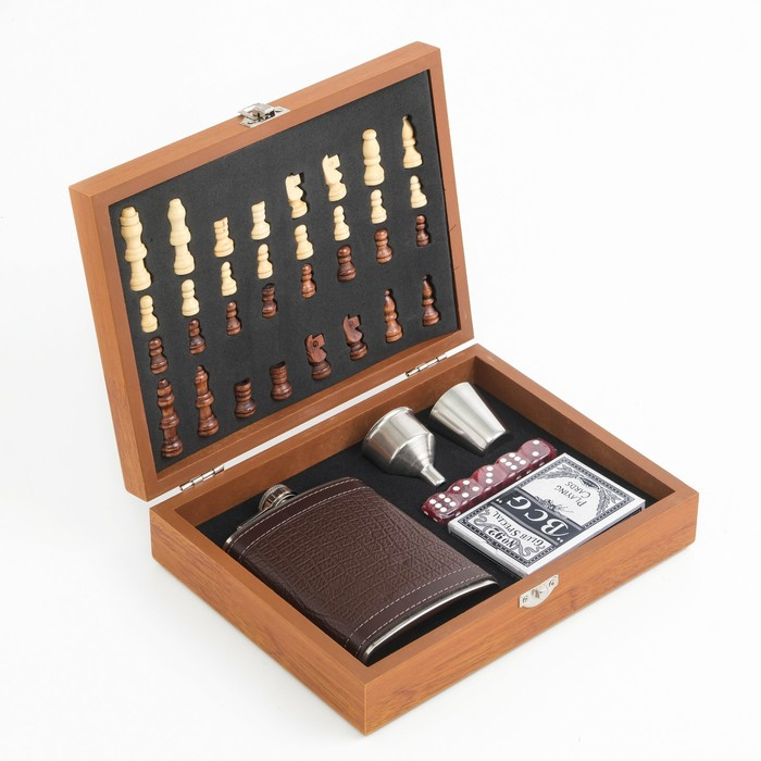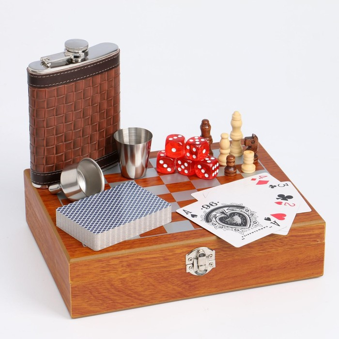 Набор 6 в 1: фляжка 8 oz, рюмка, воронка, кубики 5 шт, карты, шахматы, 18 х 24 см , микс