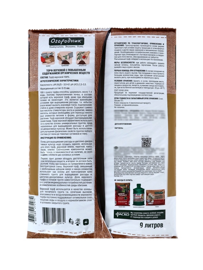 Торф Огородник верховой, 9 л.