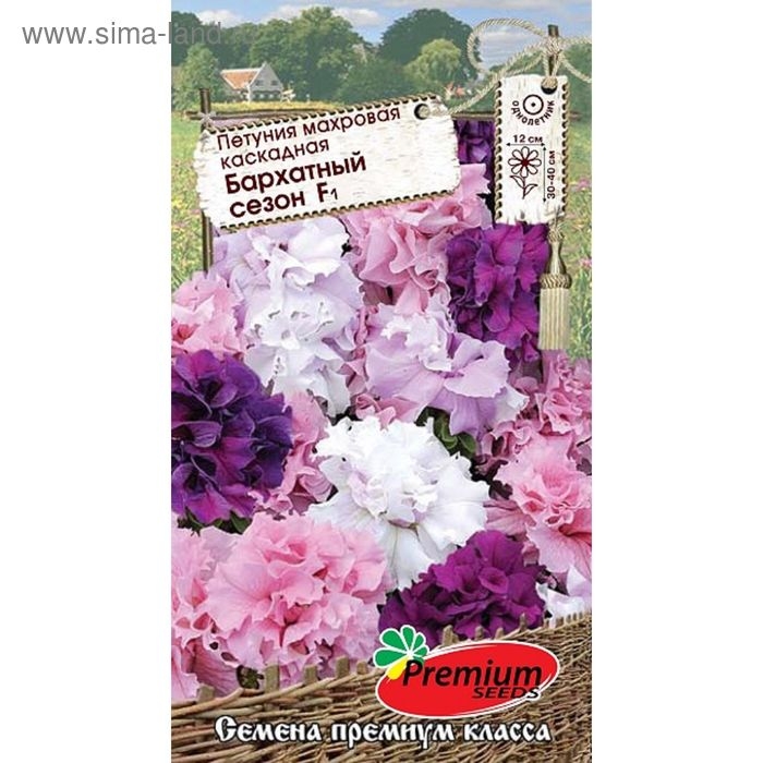 «Бархатный сезон» — это смесь ярких махровых каскадных петуний. Растение имеет гибкие длинные стебли, многочисленные крупные бутонами разнообразной окраски по 12 см в диаметре. Сорт отличает обильное и продолжительное цветение и быстрое развитие, что делает его превосходным декоративным элементом для балконов, подвесных кашпо и корзин. Растение предпочитает лёгкие, плодородные, хорошо дренированные почвы.