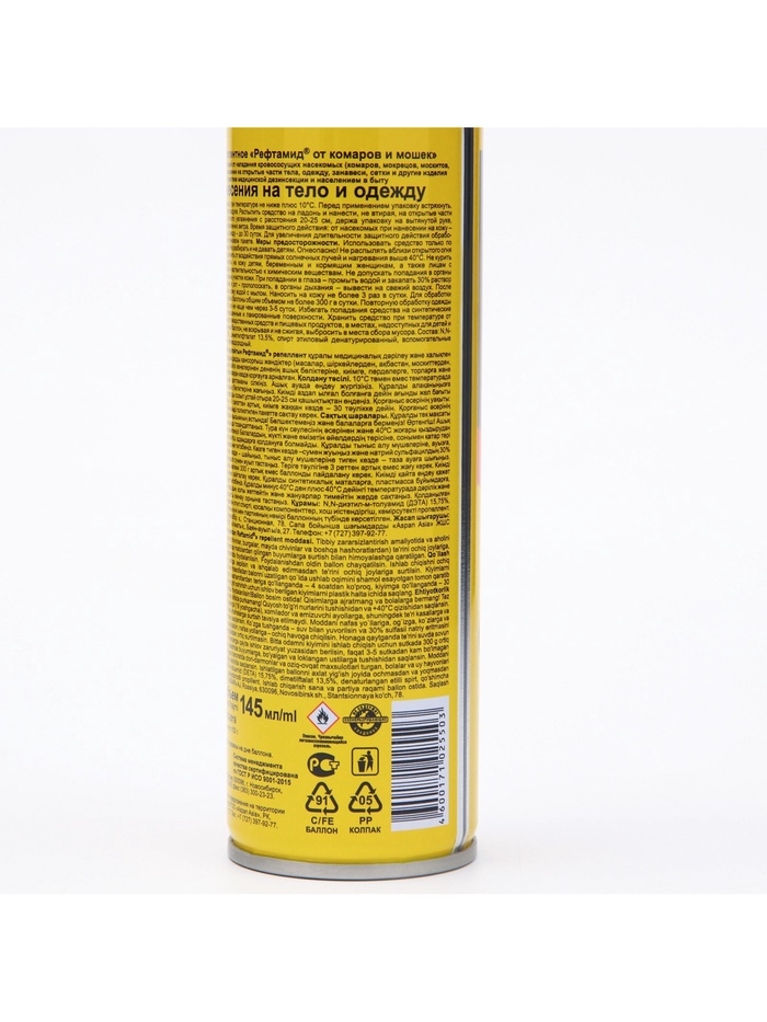 В настоящее время многие люди сталкиваются с проблемой насекомых, особенно в летний период. Одним из эффективных способов защиты от комаров и других насекомых является использование репеллентов. Сегодня мы хотим рассказать о репелленте "Рефтамид", который является одним из наиболее популярных продуктов на рынке.Аэрозольный репеллент "Рефтамид" разработан специально для защиты от комаров и других насекомых. Он содержит активное вещество диэтилтомидат, которое эффективно отпугивает насекомых и обеспечивает защиту до 5 часов. Кроме того, репеллент содержит аромат цитруса или ванили, что делает его использование более приятным и комфортным.Одним из главных преимуществ репеллента "Рефтамид" является его удобство в использовании. Аэрозольный спрей легко наносится на кожу и не оставляет жирных следов. Кроме того, он быстро высыхает и не вызывает дискомфорта.Несмотря на то, что репеллент "Рефтамид" является эффективным средством защиты от комаров и других насекомых, необходимо соблюдать некоторые меры предосторожности при его использовании. Например, не стоит наносить его на открытые раны или слизистые оболочки, а также наносить слишком близко к глазам.В заключение можно сказать, что репеллент "Рефтамид" является эффективным и удобным в использовании средством защиты от комаров и других насекомых. Благодаря своему составу и аромату цитруса или ванили он обеспечивает не только защиту, но и приятные ощущения во время использования. Однако перед его применением необходимо ознакомиться с инструкцией и соблюдать меры предосторожности. СоставN,N-диэтил-м-толуамид (ДЭТА) 15,75%,диметилфталат 13,5%,бутан/пропан/изобутан смесь >30%,спирт этиловый денатурированный 15-30%,глицерин <5%,натрий тетраборнокислый <5%.