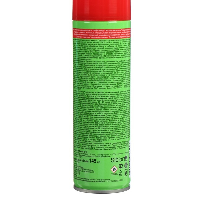 Средство инсектоакарицидное (поражение клеща) предназначено для защиты людей от таежных и лесных клещей, блох (переносчиков возбудителей опасных заболеваний человека: клещевой энцефалит, боррелиоз, чума и др.) при обработке одежды и других изделий из ткани. Только для обработки одежды. Будьте внимательны!Способ применения:Перед применением баллон встряхнуть. Одежду и другие изделия из ткани обрабатывать на открытом воздухе (в защищенном от ветра месте).Средство распылять на изделия с расстояния 20-25 см. Общее время обработки брюк и рубашки не более 2 минут. Особенно тщательно обрабатывать одежду вокруг щиколоток, голеней, коленей, бедер, плечевого пояса и мест возможного проникновения клещей и блох к телу.Одежду просушить и надевать на нижнее белье.Время защитного действия: от клещей и блох до 15 суток.ВНИМАНИЕ! Повторную обработку одежды проводить через 10–15 суток или после стирки. Нарушение правил поведения и способа применения средства может привести к присасыванию клещей. Одному человеку использовать для обработки баллоны общим объемом не более 300 мл в сутки. Не обрабатывать одежду на человеке и не надевать ее до полного высыхания. Токсично! Огнеопасно!Состав: альфациперметрин 0,2%, имипротрин 0,15%, отдушка 5%, сорбитан олеат 5%, изопарафин 5%, бутан/пропан/изобутан смесь 30%, нефрас 30%.