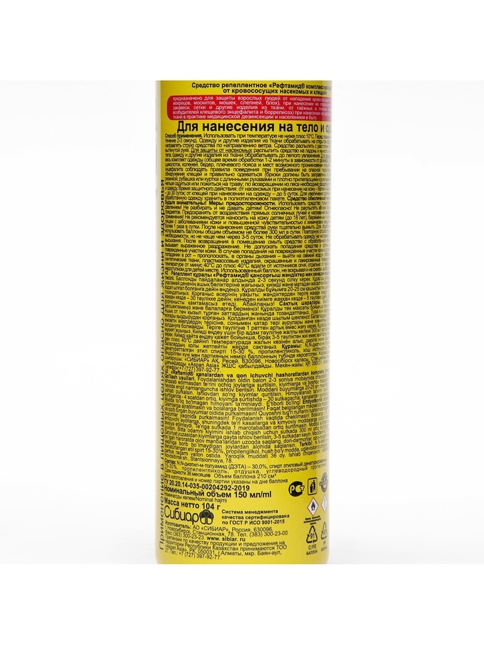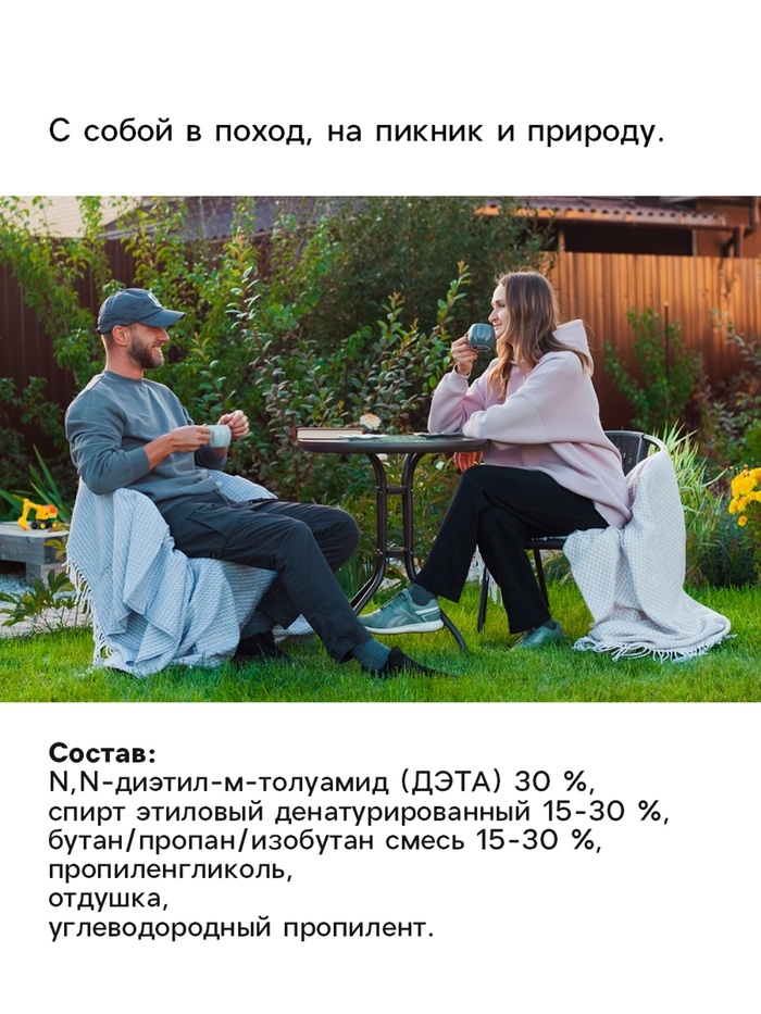 ОписаниеРепеллентный аэрозоль от комаров "Рефтамид" Антикомар Усиленный с ароматом ванили/цитруса - это эффективное средство, которое защитит вас от укусов насекомых во время отдыха на природе или прогулки по лесу.Для достижения максимальной эффективности, рекомендуется наносить репеллент на одежду и открытые части тела. При этом следует помнить, что продукт не предназначен для нанесения на лицо.В состав репеллента входят натуральные компоненты, такие как экстракты растений, которые обладают отталкивающими свойствами по отношению к комарам и другим насекомым. Благодаря этому, вы сможете наслаждаться прогулками на свежем воздухе, не беспокоясь о возможных укусах.Однако, необходимо соблюдать меры предосторожности при использовании данного средства. Не рекомендуется наносить репеллент на поврежденную кожу или на места, где имеются высыпания. Также следует избегать попадания продукта в глаза и на слизистые оболочки.В целом, аэрозоль репеллентный от комаров "Рефтамид" Антикомар Усиленный с ароматом ванили/цитруса - это безопасное и эффективное средство для защиты от комаров и других насекомых. Оно позволит вам наслаждаться природой без дискомфорта и опасений.СоставN,N-диэтил-м-толуамид (ДЭТА) 20%, диметилфталат 10%, бутан/пропан/изобутан смесь >30%, (спирт входящий в рецептуру) * 15-30%, глицерин < 5%.
