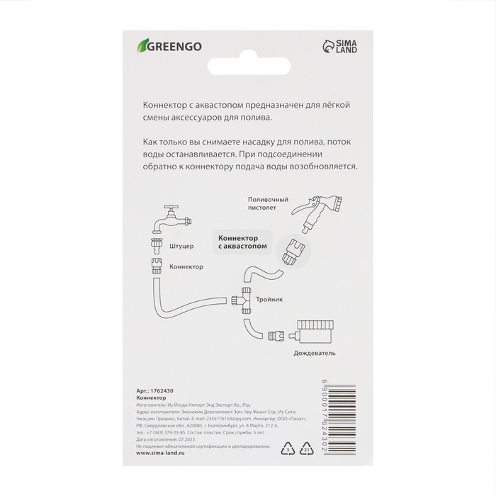 Коннектор с аквастопом, 5/8" (16 мм), быстросъёмное соединение, рр-пластик, Greengo