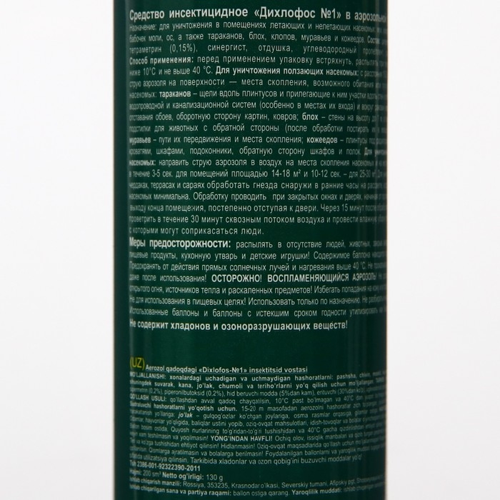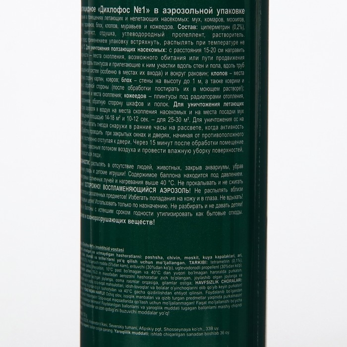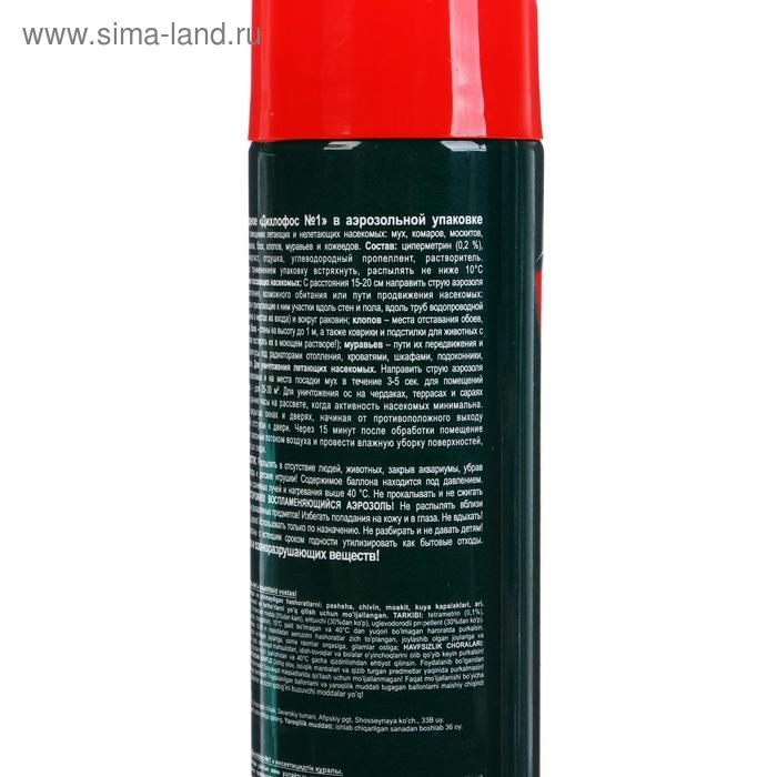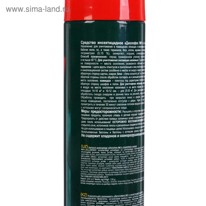Инсектицидное "Дихлофос №1" в аэрозольной упаковке предназначено для уничтожения в помещениях летающих и нелетающих насекомых: мух, комаров, москитов, бабочек, моли, ос, а так же тараканов, блох, клопов, муравьев, и кожеедов.