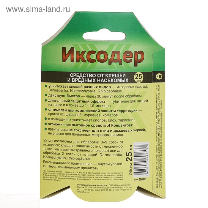 «Иксодер» оптимален для комплексной защиты территории против клещей, а также ос, шершней, муравьев… При этом практически не токсичен для птиц и дождевых червей, почвенных микроорганизмов. Обработку проводят путем опрыскивания или с помощью генератора аэрозольного тумана.