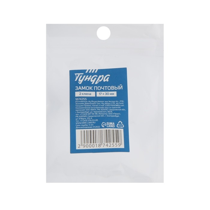 Замок почтовый ТУНДРА, 17х30 мм, 2 ключа
