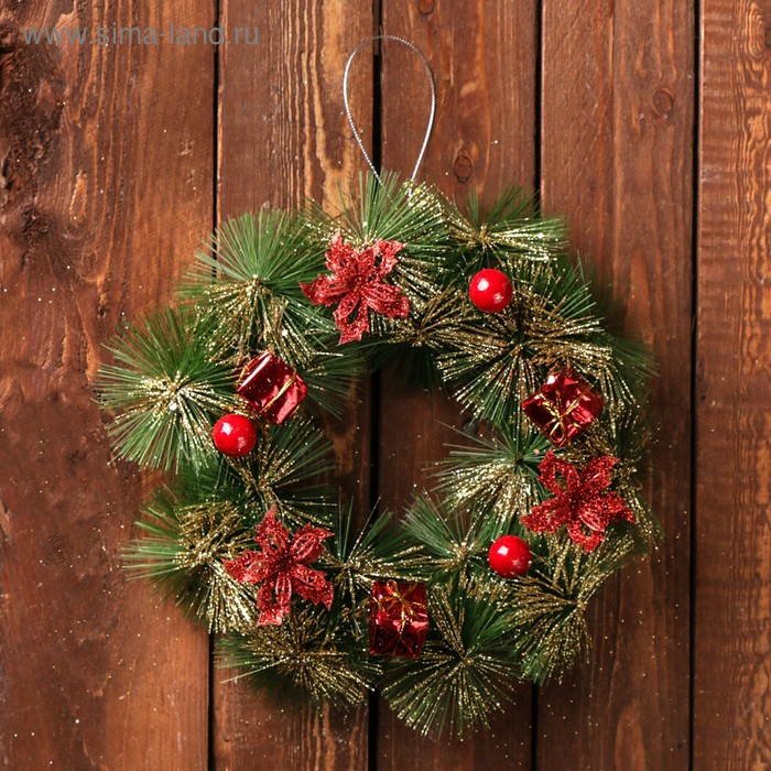 Венок новогодний d-20 см "Подарочек зелёный с красными цветами"