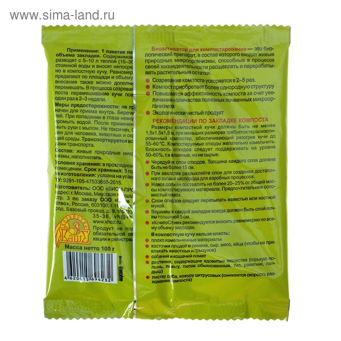 «КомпоСтим» - созревание компоста ускоряется в 2–5 раз, компост приобретает более однородную структуру, повышается эффективность компоста за счет увеличения количества полезных почвенных микроорганизмов. Экологически чистый продукт.