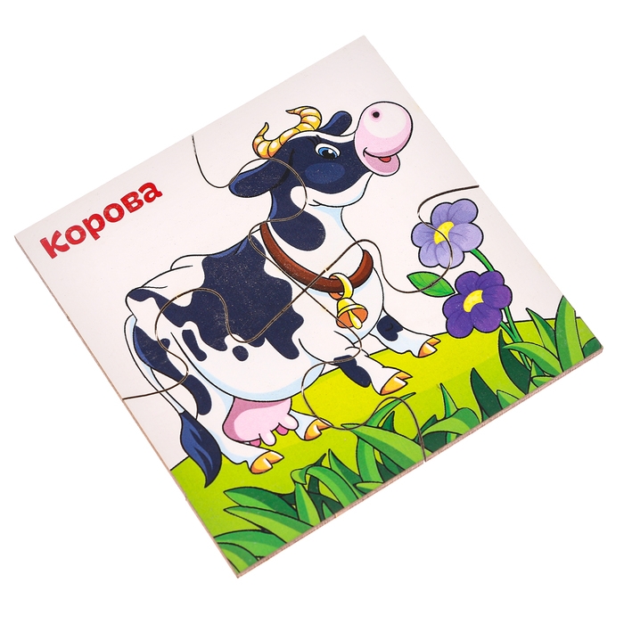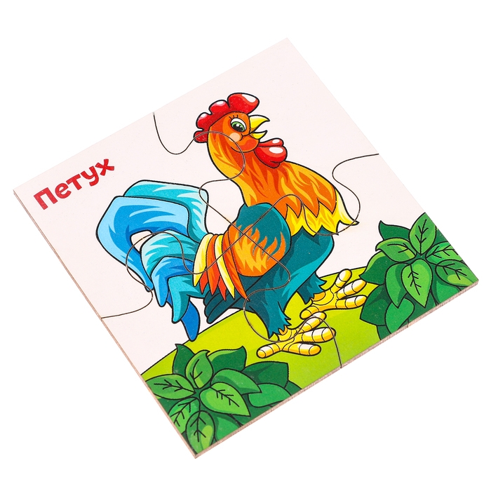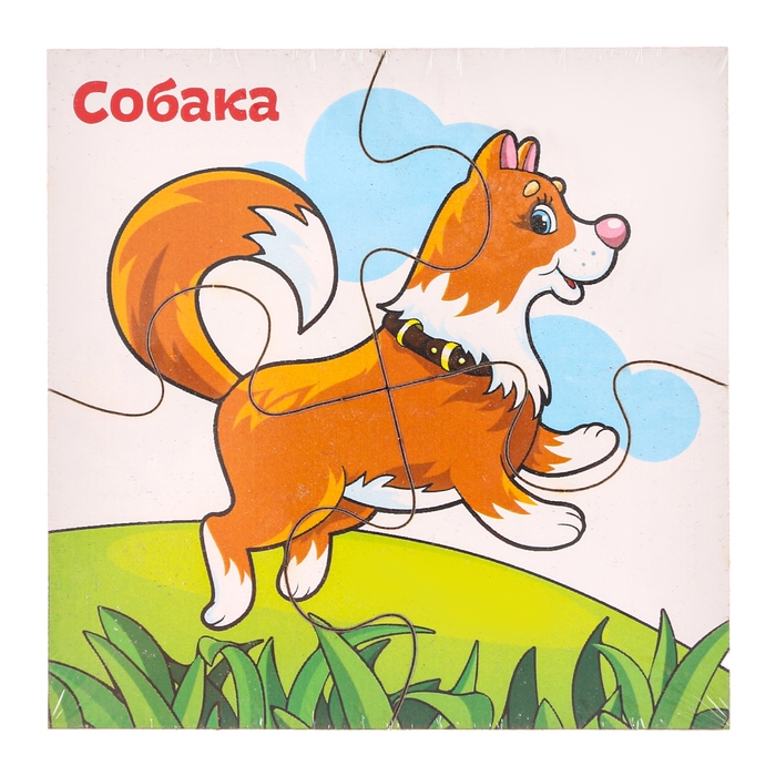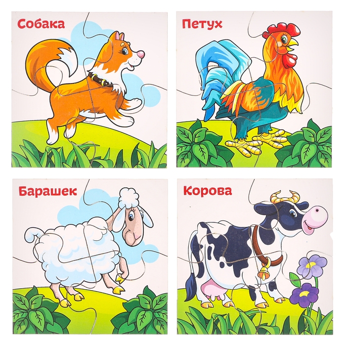 Яркий пазл подойдёт для самых маленьких деток, каждый их них состоит из четырёх элементов. Насыщенные цвета потренируют зрительное восприятие крохи. Расскажите ребёнку о домашних животных — это поможет развить кругозор малыша.