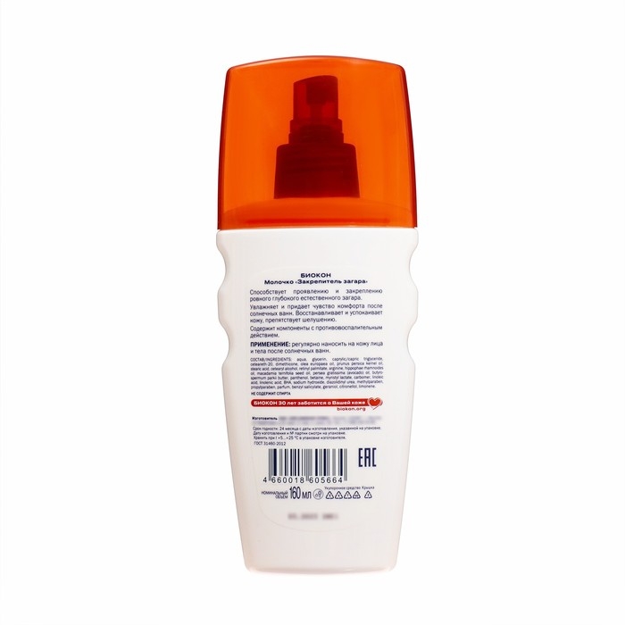Молочко "Закрепитель загара" от Биокон – это увлажняющее средство, предназначенное для ухода за кожей после пребывания на солнце. Оно содержит пантенол, который способствует регенерации кожи, увлажнению и снижению риска шелушения после загара.