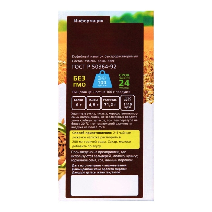 Состав напитка основывается на тщательно отобранных ингредиентах: в нем нет искусственных добавок и консервантов, так что вы можете наслаждаться своим любимым кофе без лишних забот. Ячмень -второй кофезаменитель после цикория. В напитках из ячменя большое содержание витаминов группы В, а также С, Е и К, а из микро- и макроэлементов - калий, фосфор, магний, натрий, селен, железо, цинк и др. Элементы злака способствуют снятию воспалений слизистой желудка, облегчают протекание болезней почек. В их составе присутствуют углеводы, белки и клетчатка, а также фосфор и кальций."