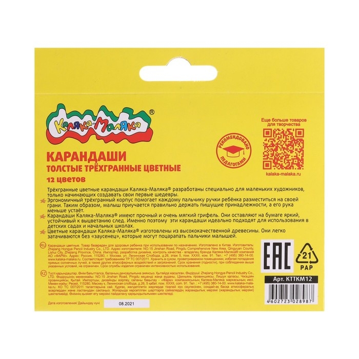 Карандаши 12 цветов "Каляка-Маляка", трёхгранные, толстые