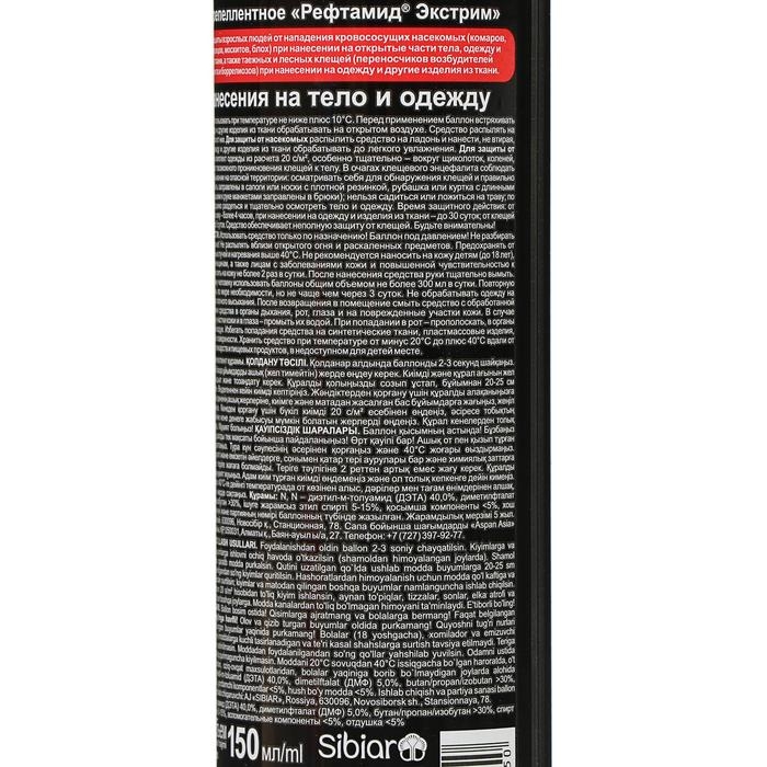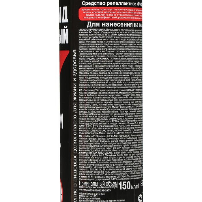 Рефтамид - это усиленный универсальный супер эффективный репеллентный аэрозоль 8 в 1 150мл. Безопасен для кожи. Средство можно наносить на открытые части тела и обработать одежду. Репеллент от комаров spray Экстрим предназначен для защиты людей также против слепней, мокрецов, москитов, блох. Рефтамид усиленный имеет длительность защиты от укусов – 8 часов. В составе препарата около 40% активного вещества ДЭТА. ДЭТА – это один из самых лучших эффективных и распространенных репеллентов от блох, клещей и комаров в мире. Спрей от клещей, в том числе от таежных и лесных — переносчиков возбудителей клещевого энцефалита и боррелиоза. От мошек антиклещ прекрасно защитит вас в саду и на улице. Спрей от комаров предназначен для защиты взрослых людей от нападения кровососущих насекомых на природе. Набор спреев отлично подойдет в поход охотникам на охоту, грибникам в лес, рыбакам на рыбалку.СоставN, N – диэтил-м-толуамид (ДЭТА) 40,0%, диметилфталат (ДМФ) 5,0%, бутан/пропан/изобутан >30%, спирт этиловый денатурированный 5- 15%, вспомогательные компоненты <5%, отдушка < 5%