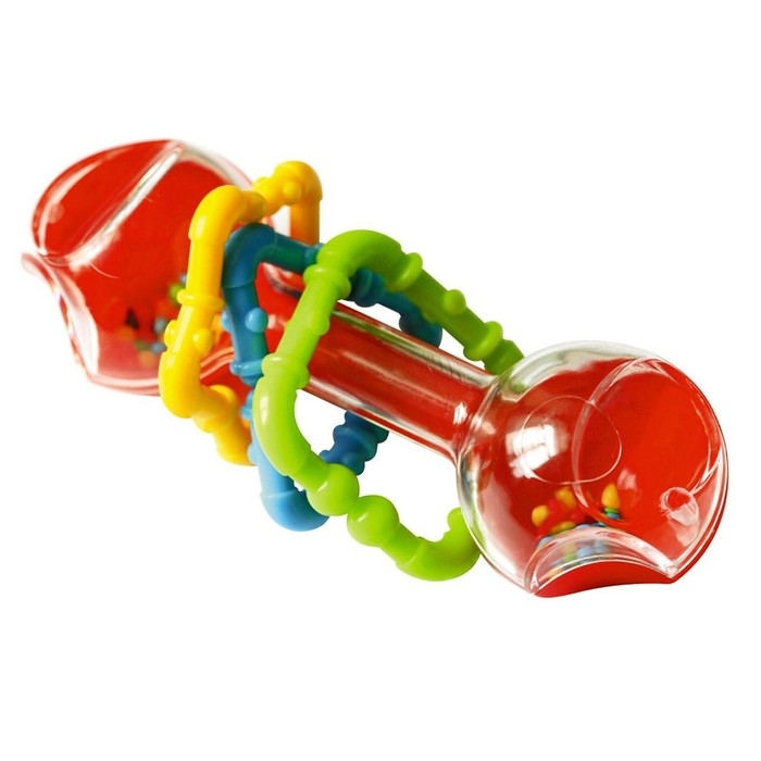 Погремушка в форме гантельки подойдёт для игр и развлечений малышей. Она всегда будет вызывать интерес, независимо от того, как они её повернут.