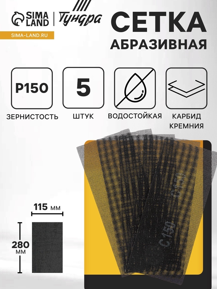 Сетка абразивная ТУНДРА, водостойкая, карбид кремния, 115×280 мм, Р150, 5 шт.