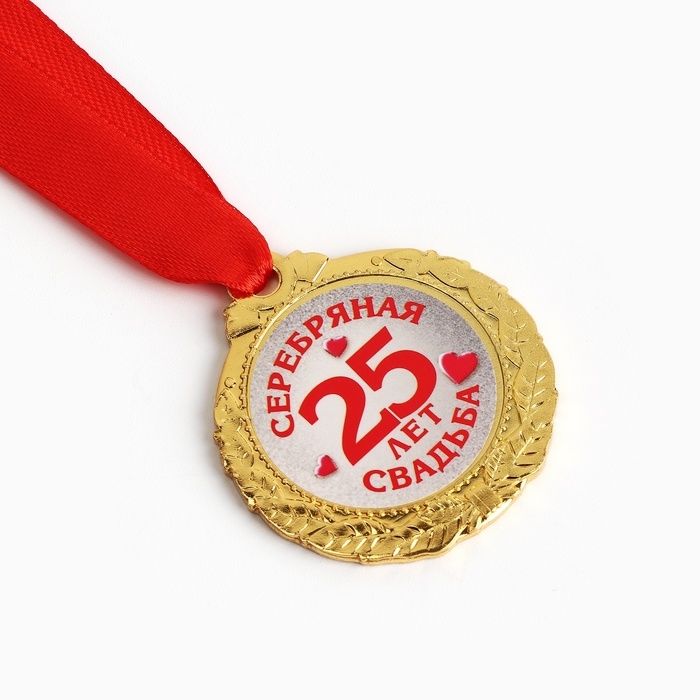 Хотите поздравить супругов с годовщиной брачной жизни по-особенному? Медаль свадебная на открытке «25 лет серебряная свадьба», d=4 см подчеркнёт торжественность данного события. Награда изготовлена из металла золотого цвета и дополнена красной лентой.