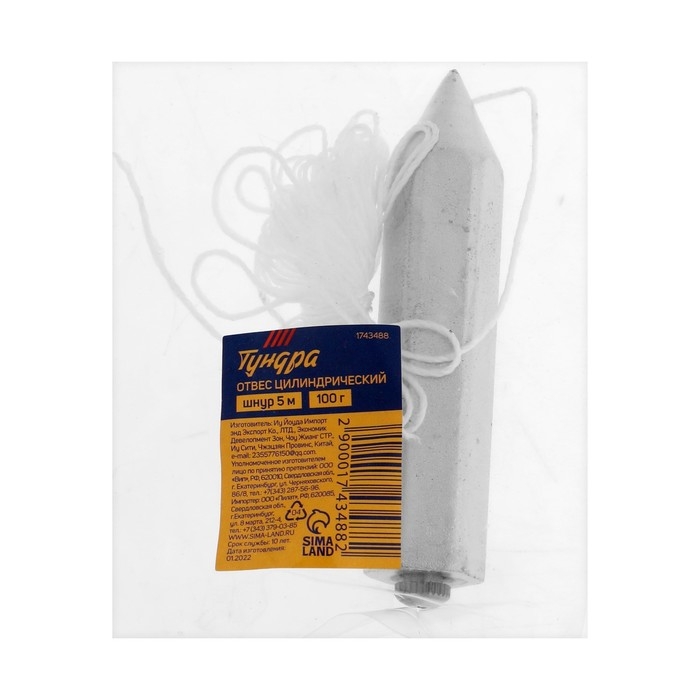 Отвес цилиндрический ТУНДРА, шнур 5 метров, 200 г
