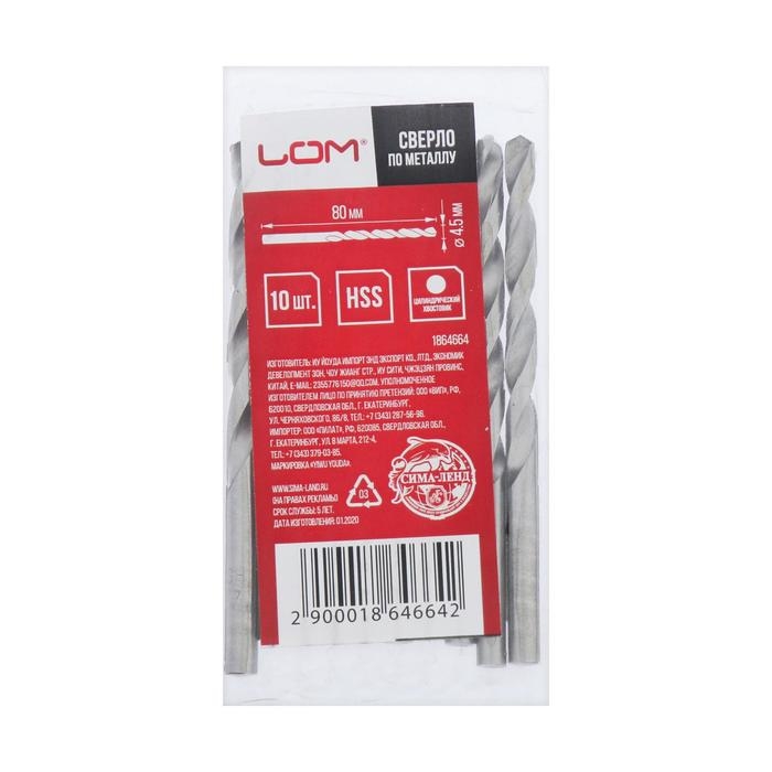 Сверло по металлу ЛОМ, HSS, цилиндрический хвостовик, 4.5×80 мм, 10 шт.