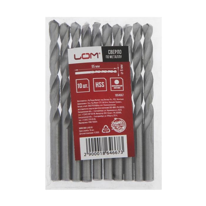 Сверло по металлу ЛОМ, HSS, цилиндрический хвостовик, 6×95 мм, 10 шт.