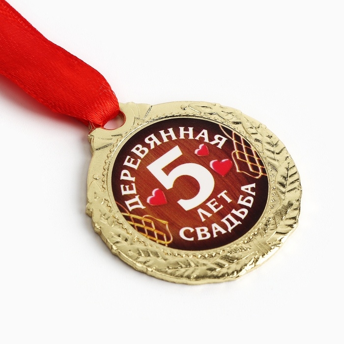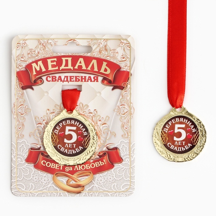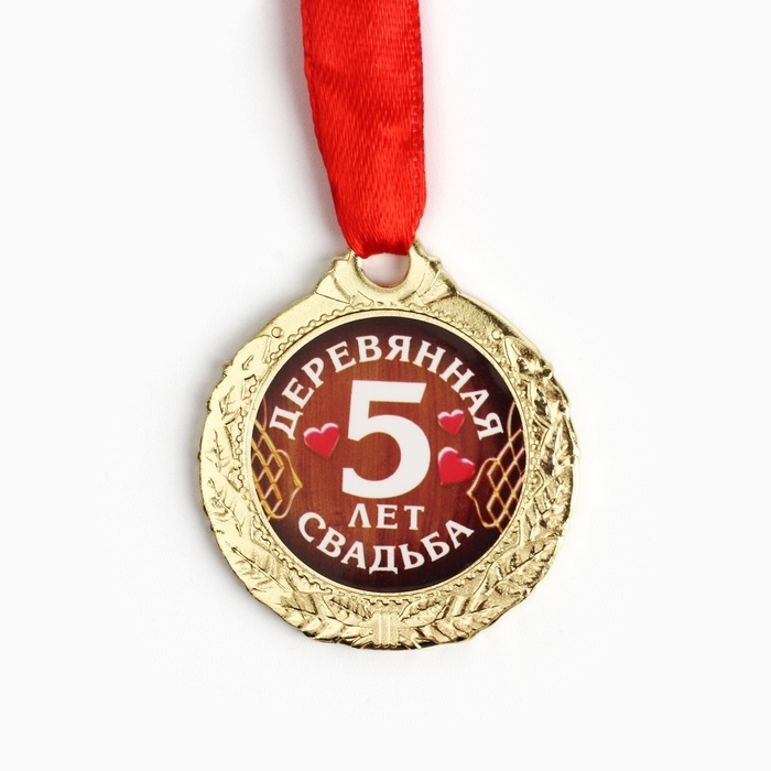 Хотите поздравить супругов с годовщиной брачной жизни по-особенному? Медаль свадебная на открытке «5 лет деревянная свадьба», d=4 см подчеркнёт торжественность данного события. Награда изготовлена из металла золотого цвета и дополнена красной лентой.