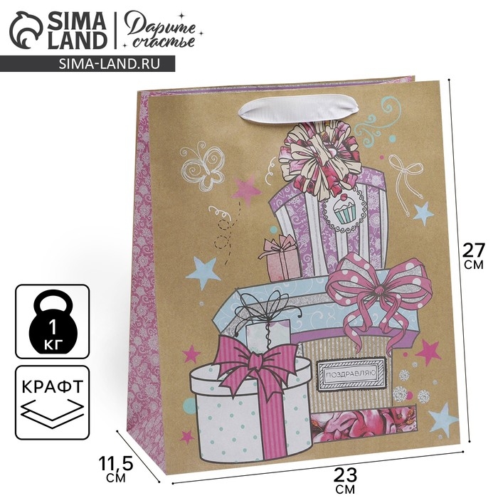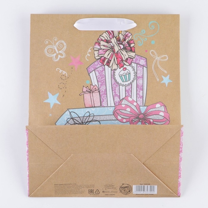 Пакет подарочный крафтовый вертикальный, упаковка, «Долгожданные подарки», ML 23 х 27 х 11,5 см