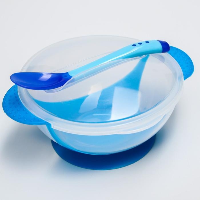 Набор для кормления, 3 предмета: тарелка на присоске 350 мл, крышка, термоложка, цвет синий